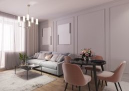 В шоу-руме проекта можно увидеть два лота формата «евро». В каждой квартире установлена мебель, чтобы продемонстрировать, как можно использовать пространство комнат в полной мере, проведена отделка в стиле «темный минимализм» и «светлая классика». Для отделки «под ключ» используются износостойкие и качественные материалы: ламинат EGGER, плитка Kerama Marazzi, сантехника ROCA.